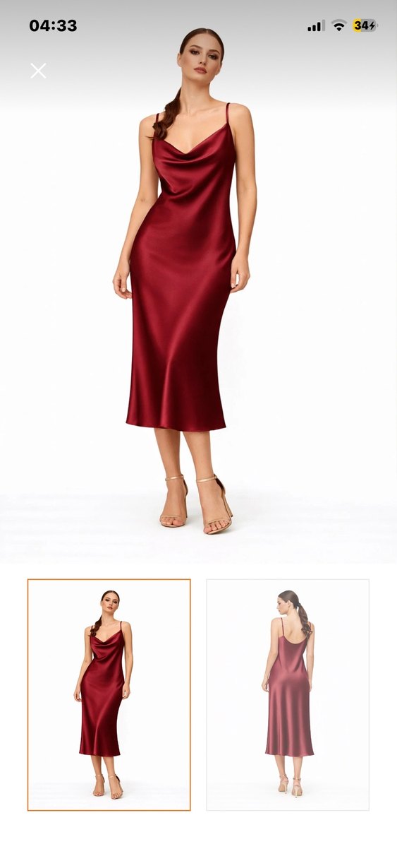 Parlak bordo saten kumaştan, drapeli V yakalı ve ince askılı, uzun ve vücuda oturan elbise. Romantik akşamlar için ideal.