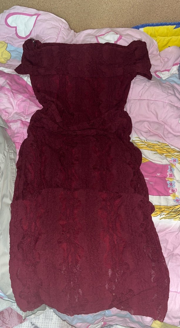 Bordo renkli, straplez yaka ve drapeli tasarıma sahip, desenli ve vücuda oturan uzun bohem elbisedir. Romantik akşamlar için uygundur.