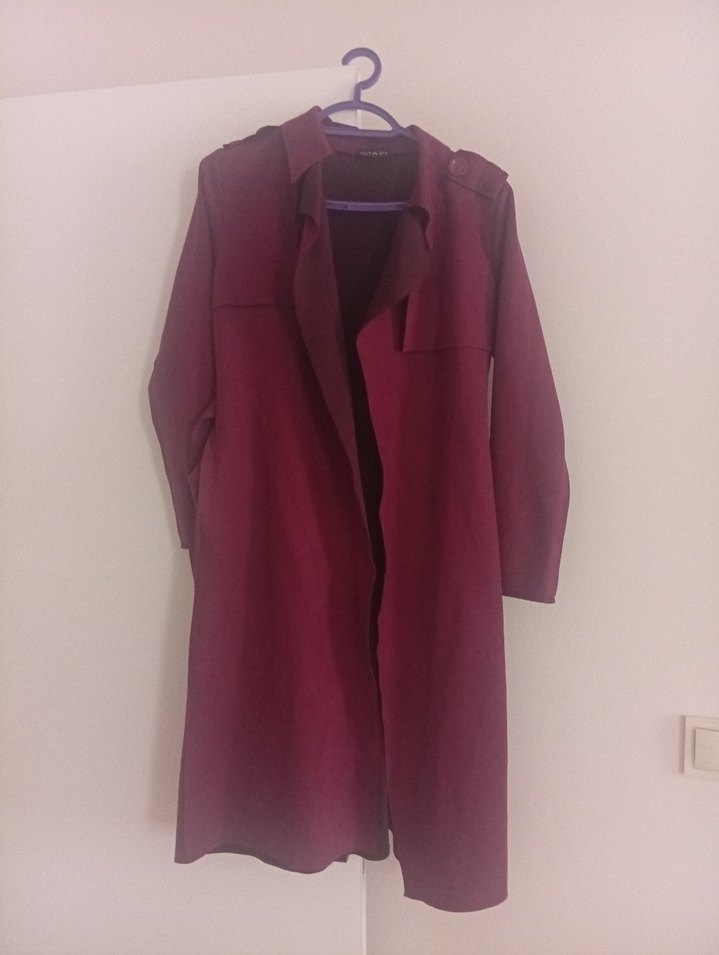 Bordo renkli uzun süet kaban, drapeli ve kesik yaka detaylıdır. Uzun kollu, regular fit ve minimalist tarzda, günlük sokak modasına uygundur.