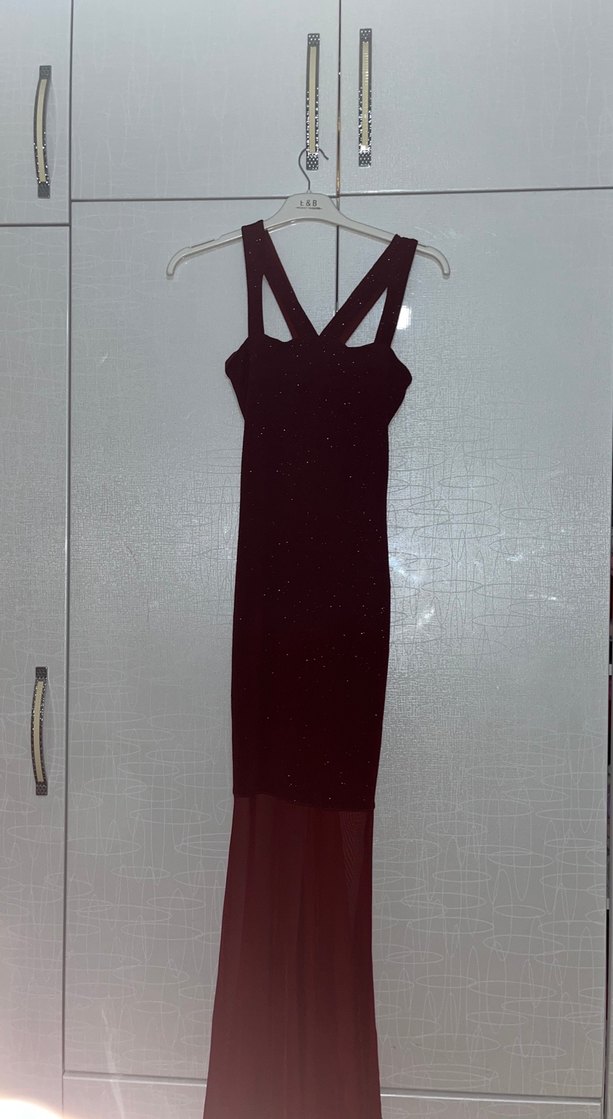 Bordo renkli uzun abiye elbise, dar kesim ve askılı kolları ile V yakaya sahiptir. Drapeli tasarımı gotik ve avangard bir stil sunar, romantik akşamlar için uygundur. Sadece bir kez giyildi