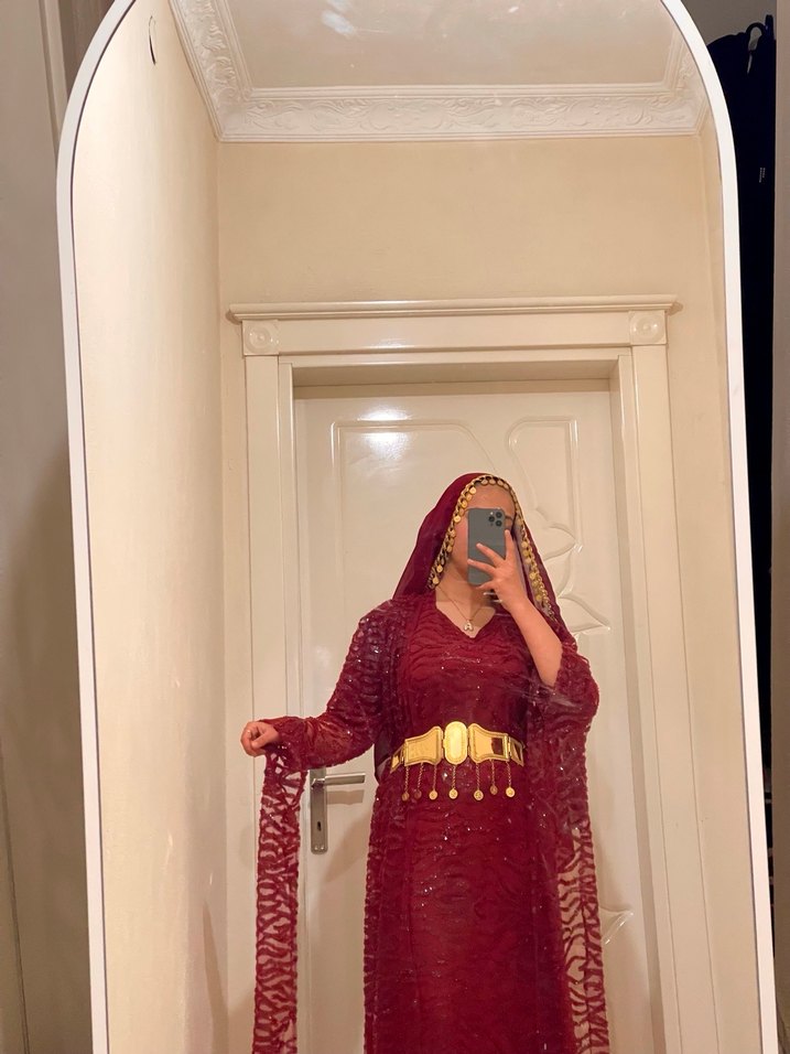 Bordo uzun, V yakalı, bol kesim, drapeli kadın hint elbisesi. Etnik desenli, uzun kollu, düğün ve mütevazı tarzlar için uygundur.