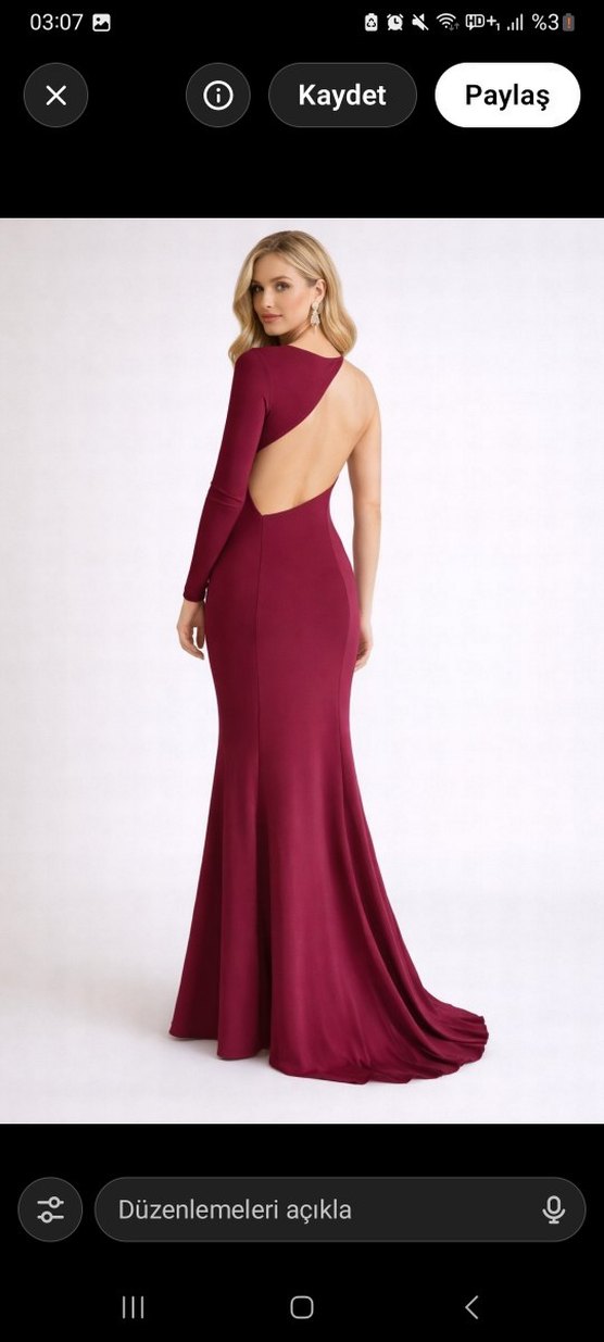Bordo renkli, uzun ve v yaka detaylı, sırt dekolteli, dar kesim abiye elbise. Parlak dokusuyla romantik akşamlar için uygundur.