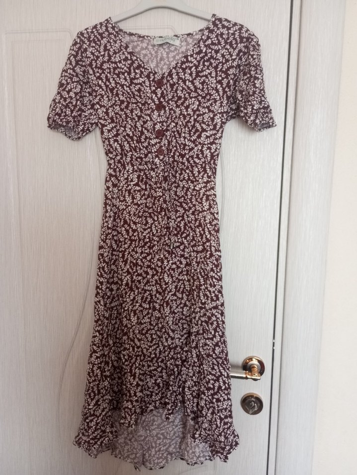 Bordo renkli, düğmeli, V yakalı, kısa kollu, bol kesim uzun elbise. Sentetik yumuşak kumaştan, baskılı desene sahip, bohem tarzda günlük kullanım için uygun.