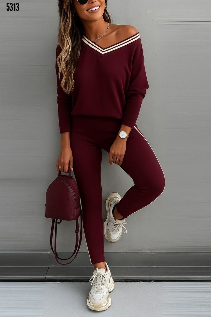 Bordo renkli, beyaz çizgili V yakalı ve kemerli, uzun kollu kadın eşofman takımı. Yumuşak sentetik kumaştan, günlük sokak stili için uygun. Ürün kodu: 5313 Kadın uzun kollu tek omuzu açık detaylı viskon iki iplik bluz ve pantolon ikili takım Beden: S-M/L-XL
