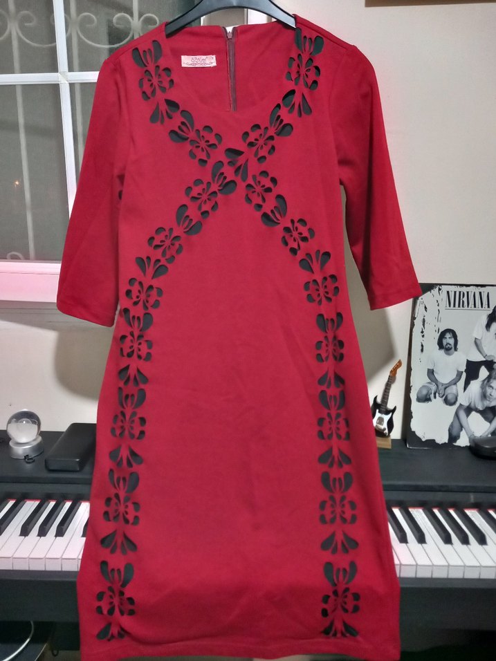 Bordo renkli, V yaka ve önünde çiçek desenleri bulunan, triko kumaştan yapılmış, diz boyu, 3/4 kollu ve vücuda oturan elbise. Dantel detaylarıyla bohem tarzı yansıtıyor, romantik akşamlar için uygun.