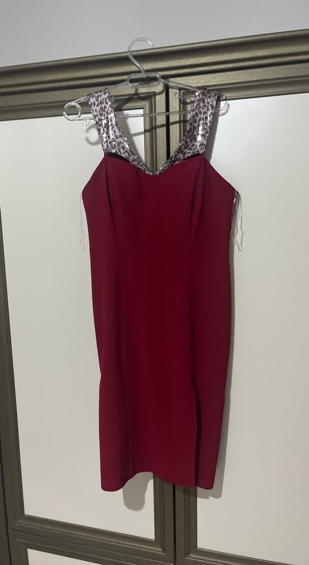 Bordo renkli, kolsuz ve V yakalı bu diz üstü elbise, vücuda oturan kesimi ve drapeli detayıyla dikkat çeker. Parlak kumaşı romantik akşamlar için uygundur. ✨