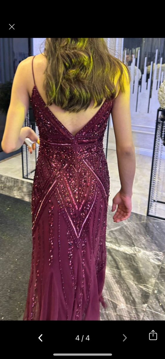 Bordo renk, V yaka ve drapeli tasarıma sahip, parlak desenli, ince askılı, midi boy abiye elbisedir. Parti için şık ve dikkat çekicidir. ✨