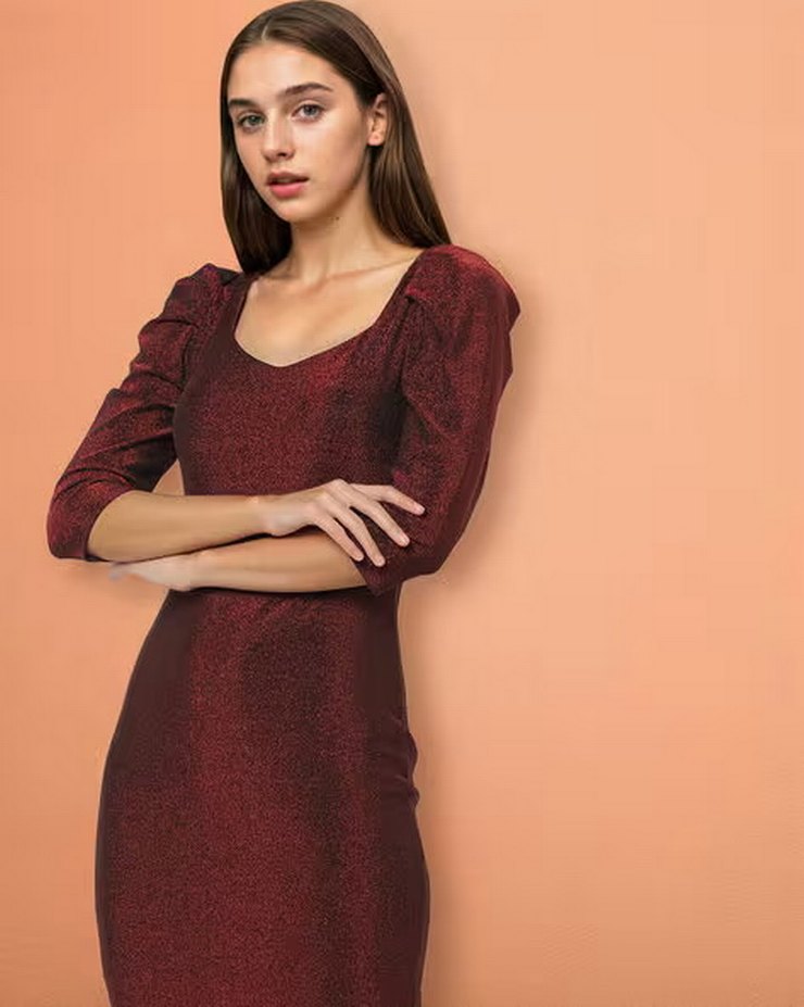 Bordo V Yaka Drapeli Midi Elbise