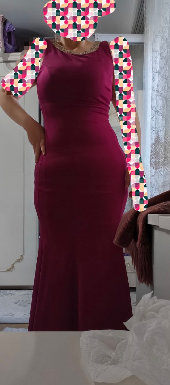 Bordo renkli, V yakalı ve kolsuz, drapeli detaylı, vücuda oturan midi elbise. Düğünler için şık ve gösterişli bir seçenek sadece bir kere gidildi sırttaki zinicirn biri kopuk tutturulur o yüzden 1800 e almıştım uygunsa veriyorum alana hayırlı olsun