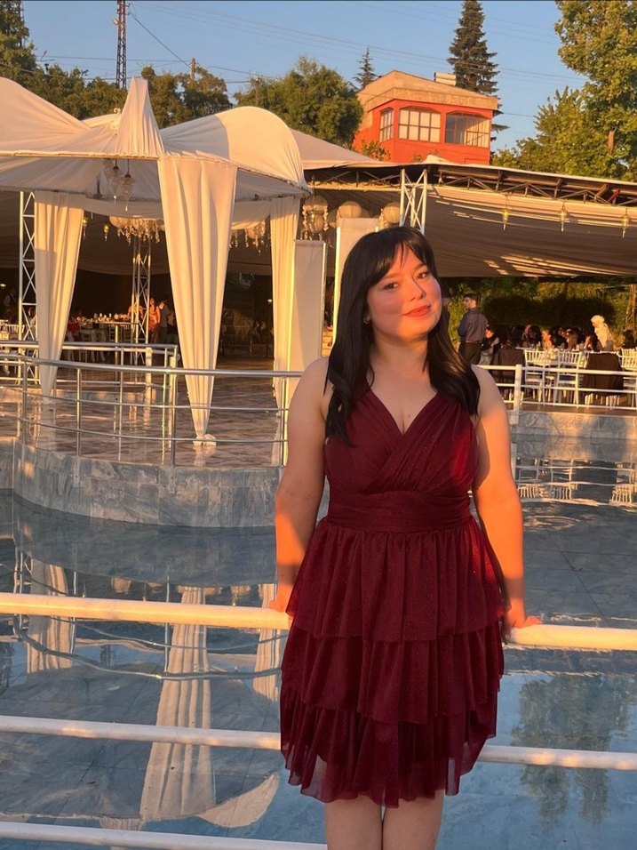 Bordo, parlak kumaştan, drapeli ve V yaka askılı, beden oturan midi elbise. Mezuniyetim için almıştım. Kendi bedenim 40(L) ama elbise 42(XL) yani ona göre alabilirsiniz