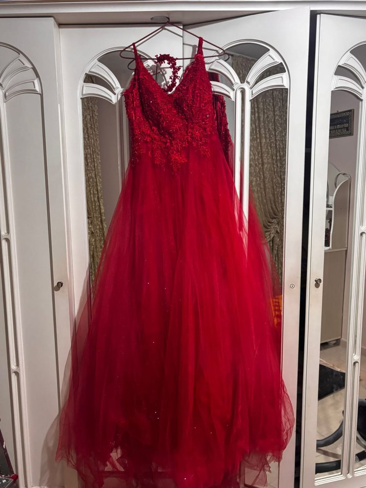 Bordo renkte, V yakalı ve drapeli uzun abiye elbise. Klasik şıklık ve bohem tarzıyla, düğün gibi özel anlar için uygun, desenli ve kolsuz model.