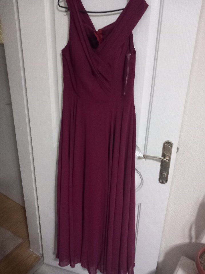 Bordo renkte, V yakalı ve kolsuz drapeli uzun abiye elbisedir. Vintage gotik tarzına uygun, vücuda oturan kesime sahiptir.