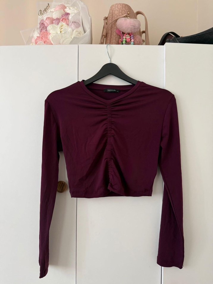 Bordo renk, uzun kollu, drapeli V yaka, keten kumaştan üretilmiş, midi boyda ve minimalist tarzda günlük kullanıma uygun fitted bluz.