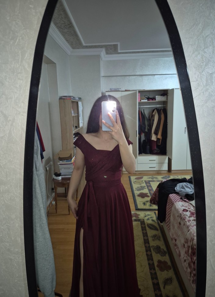 Bordo uzun abiye elbise, V yakalı ve drapeli detaylara sahip. İnce askılı, güçlü gotik stil için uygun.