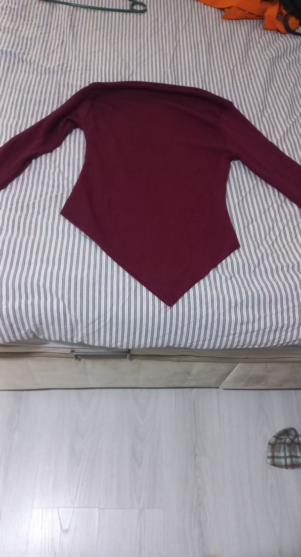 Bordo renkte, V yaka ve uzun kollu bady midi boyda asimetrik ve rahat kesimli, sentetik kumaştan üretilmiştir. M beden uumludur