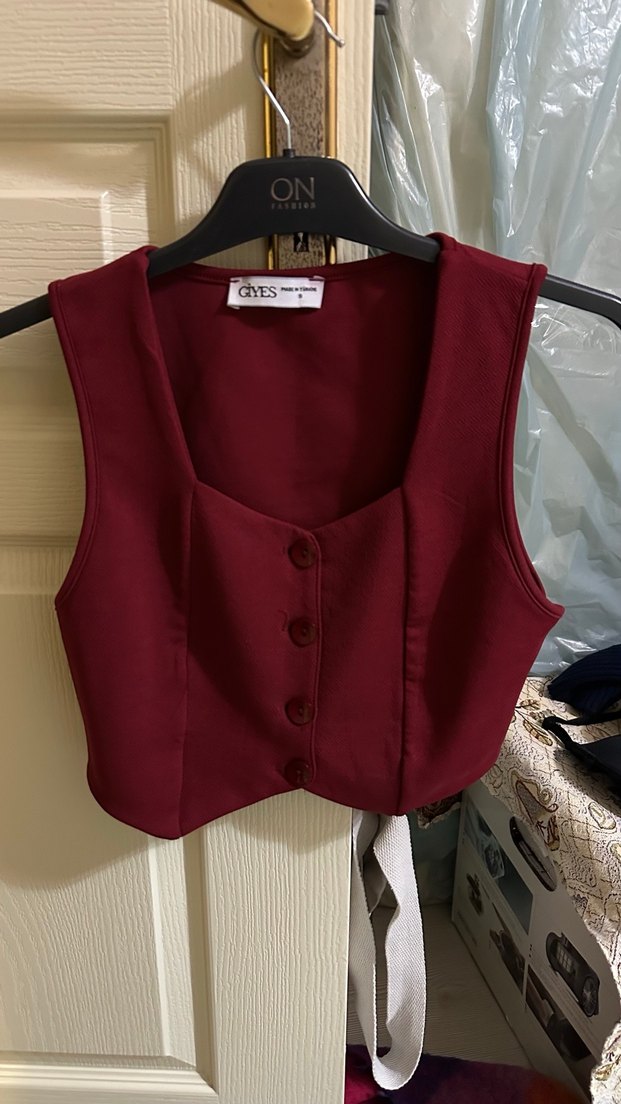 Bordo renk, V yaka ve düğmeli, süet dokulu, askılı ve normal midi uzunlukta, bohem tarzda kadın atlet.✨