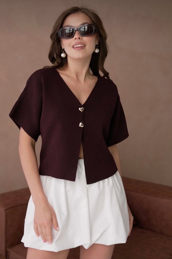 Bordo renkli, pamuk kumaştan, düğmeli bluz. V yaka ve kısa kollu, bol kesim rahat bir tasarıma sahiptir. Standart beden.