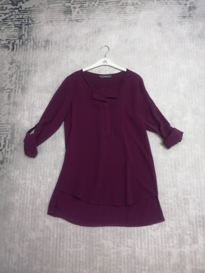 Bordo renkli, V yakalı, uzun kollu, düğmeli kadın tunik. Rahat kesimi ve midi boyu ile günlük kullanıma uygundur.