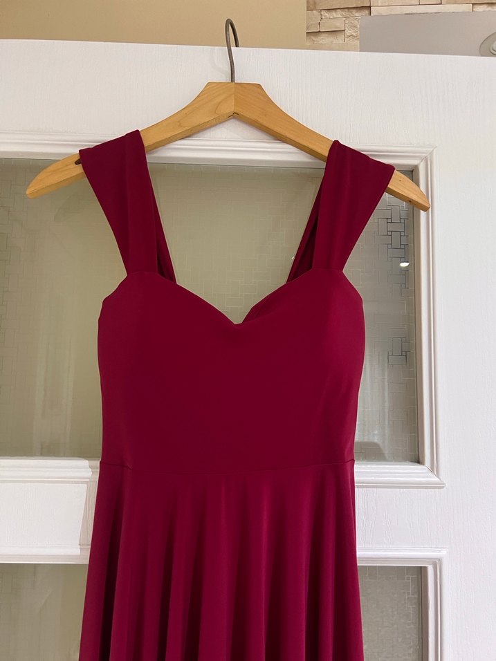 Bordo renkte, V yaka ve drapeli detaylara sahip kolsuz uzun elbise. Etiketi yok hiç giyilmedi göğüs pedi var s M uyumlu bedeni teklif atabilirsiniz göğüs ortasından uzunluk 70 cm