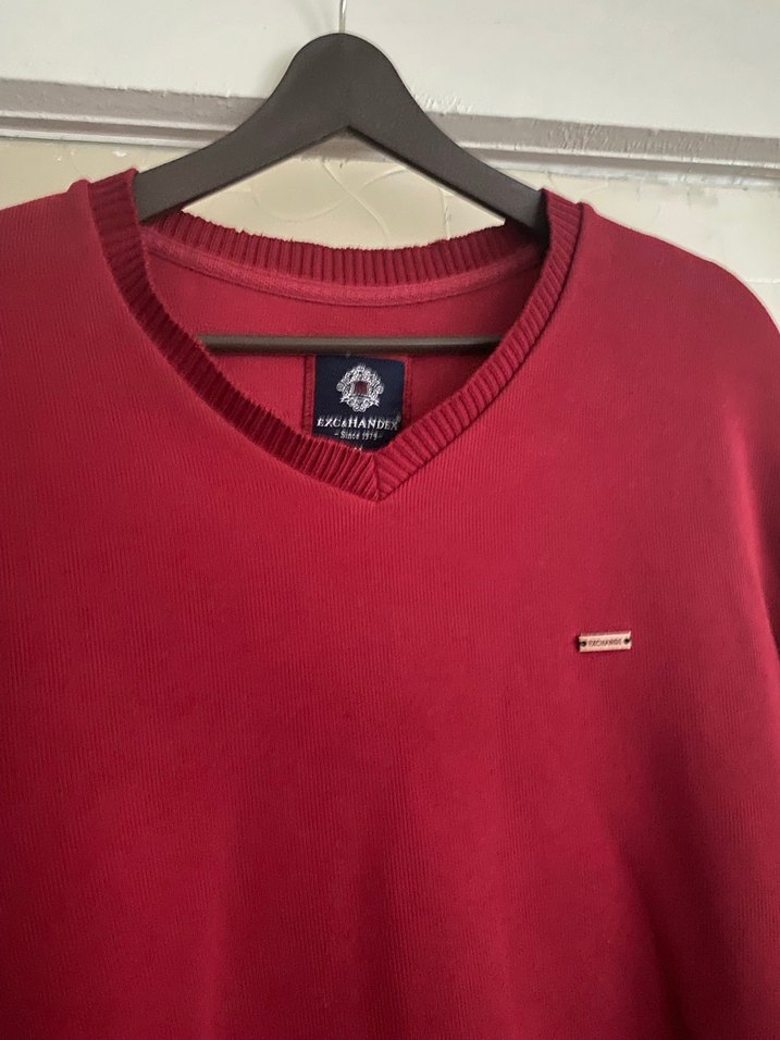 Bordo renkli, V yaka ve uzun kollu erkek triko kazak. Rahat kesimi ve sade deseniyle günlük kullanıma uygundur. M , L beden olabilir ölçüleri fotoğrafta var