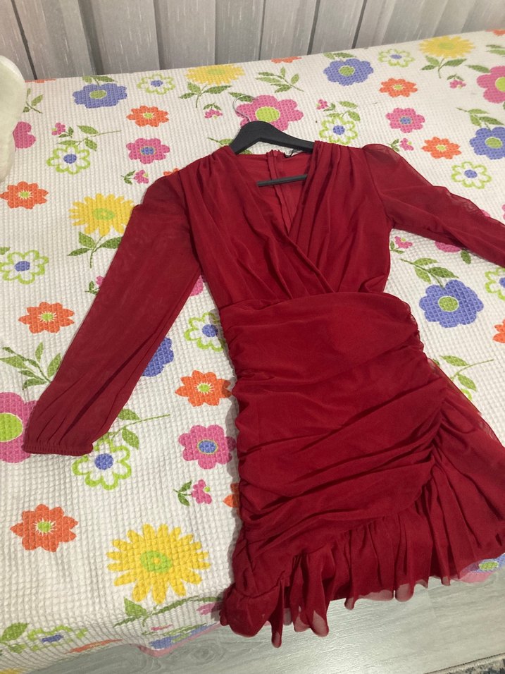 Bordo renkli, uzun kollu ve V yaka tasarımlı, vücuda oturan fitilli kadın elbise .Fırfır detaylarıyla romantik akşamlar için uygundur.