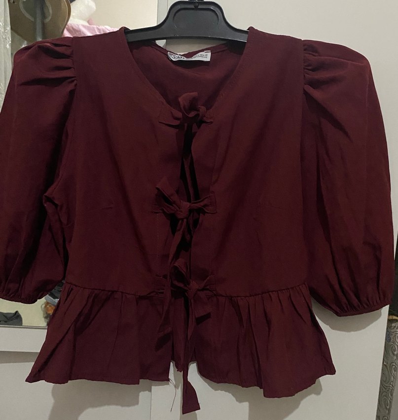 Bordo renkli, keten kumaştan yapılmış, V yakalı ve uzun kollu bol kesim bluz. Fırfır detayları ve midi boyuyla bohem tarzda, günlük kullanım için uygun.