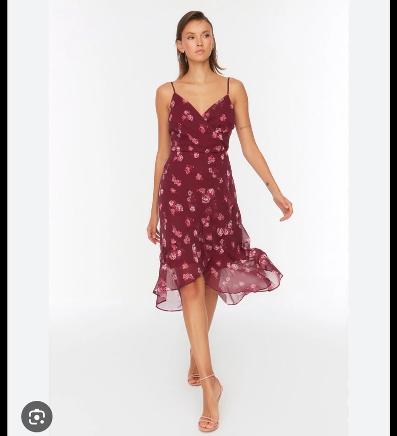 Bordo renkli, V yaka ve ince askılı, bohem tie-dye desenli, vücuda oturan midi elbise. Fırfır detaylarıyla romantik akşamlar için ideal. Milladan almıştım göğsünü kapatıp açtırdığım için biraz orası çok dikkat edersen belli oluyor onun dışında sorunsuz çok güzel bir kere giydim