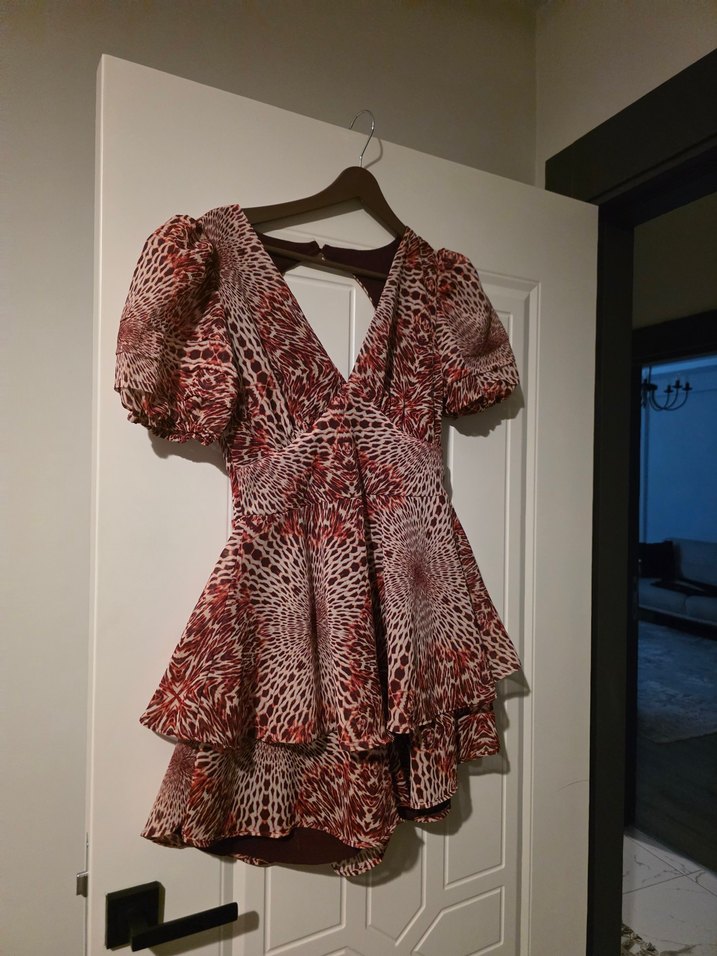 Bordo bağlama desenli, V yakalı ve fırfırlı detaylı, vücuda oturan mini elbise. Askılı kollara sahip bohem tarzda, günlük kullanım için uygun. s m uyumlu