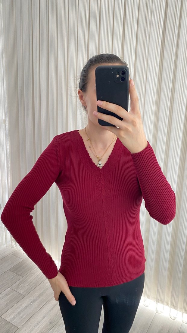 Bordo renkte, V yaka ve uzun kollu, ince triko kumaştan yapılmış, günlük kullanıma uygun, vücuda oturan kadın kazak.