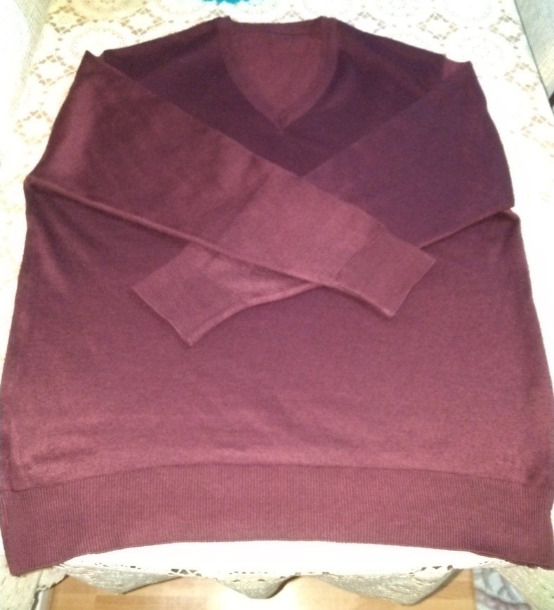 Bordo renkli, V yaka ve uzun kollu kadın triko kazak. Dökümlü tasarıma sahip, sentetik kumaştan yapılmış ve günlük kullanıma uygundur.