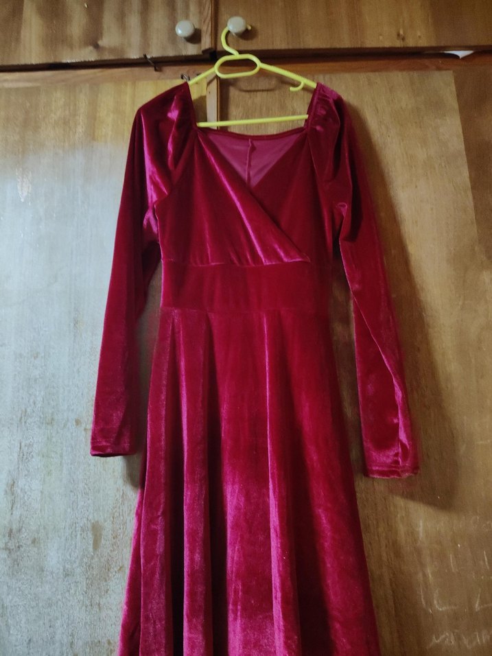Bordo parlak kumaştan, drapeli V yakalı ve uzun kollu kadın midi elbise. Gevşek kesim ve vintage gotik tarzda, parti için uygun. kuması kadıfedir