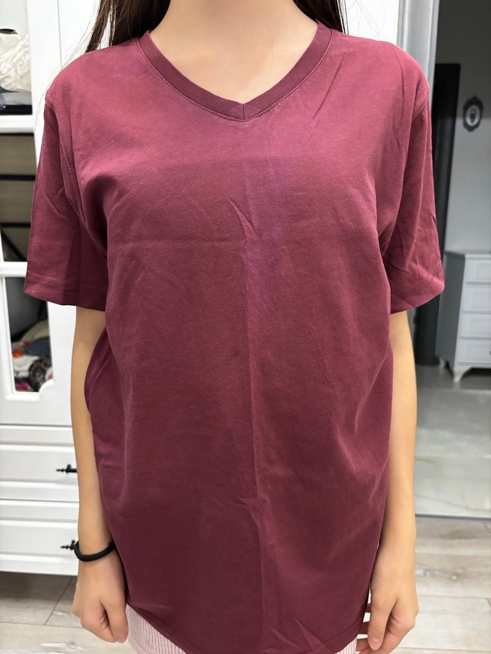 Bordo renkte V yaka, kısa kollu, bol kesim ve normal boyda kadın tişörtü. Pürüzsüz sentetik kumaştan, günlük sokak stili için uygundur.