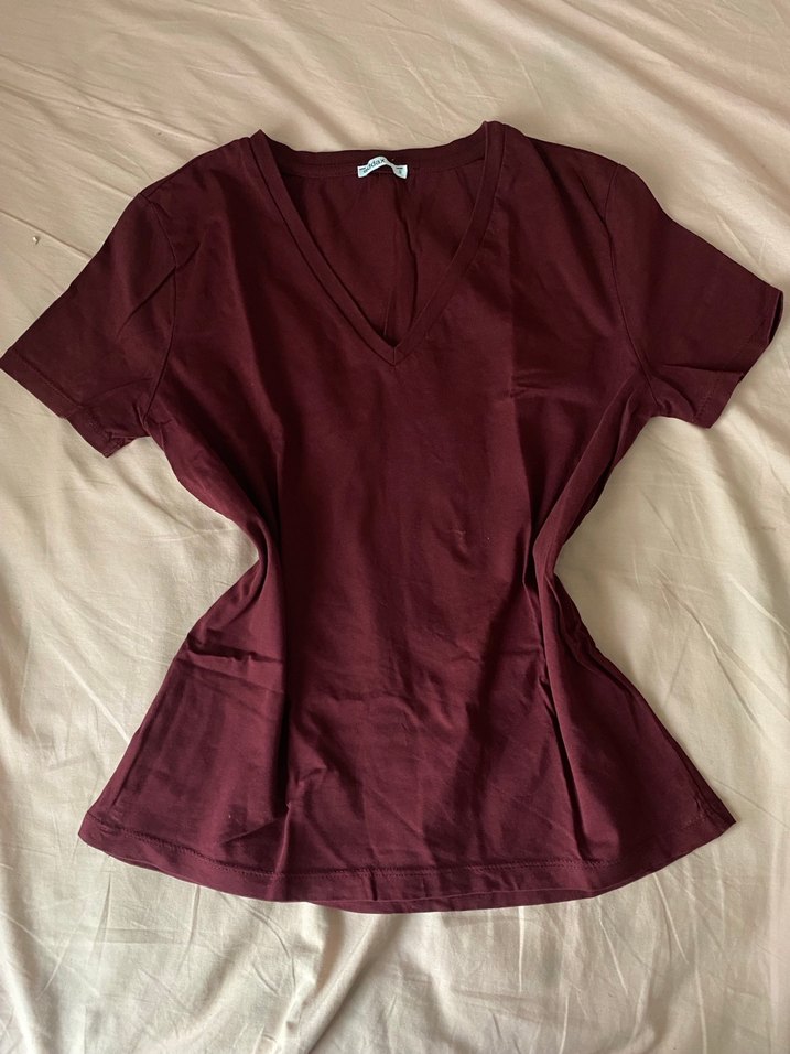 Bordo renkli, V yaka ve kısa kollu kadın tişörtü, pamuklu kumaştan. Rahat kesimi ve normal boyu ile günlük kullanıma uygun. Yalnızca bir kere giyildi.