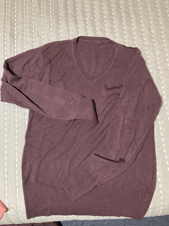Bordo renkli, V yaka ve uzun kollu, rahat kesime sahip örme triko kazak, yumuşak keten kumaştan üretilmiştir. Shefame marka