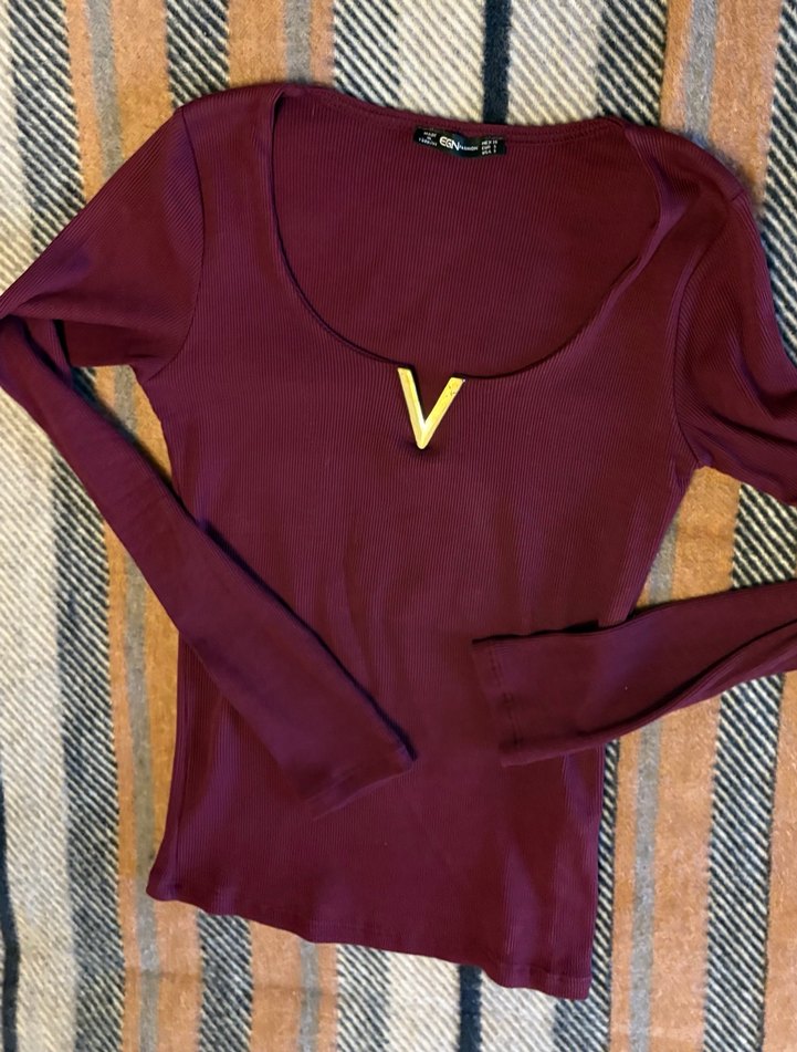Bordo renkte,V yakalı ve uzun kollu, vücuda oturan kadın bluzu. Günlük kullanım için şık ve rahat bir sokak stili sunar. Marka temsili