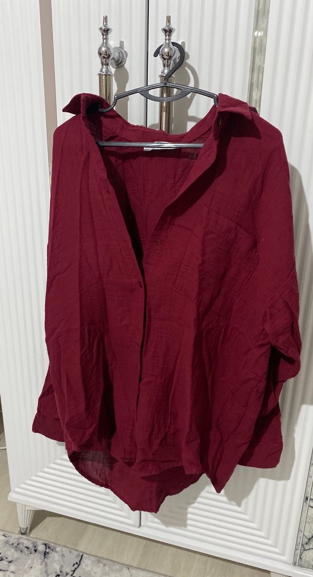 Bordo renkli, bol kesim keten kadın gömlek. Uzun kollu, V yakalı ve düğmeli önüyle midi boyda, rahat bohem tarzda günlük kullanıma uygun.
