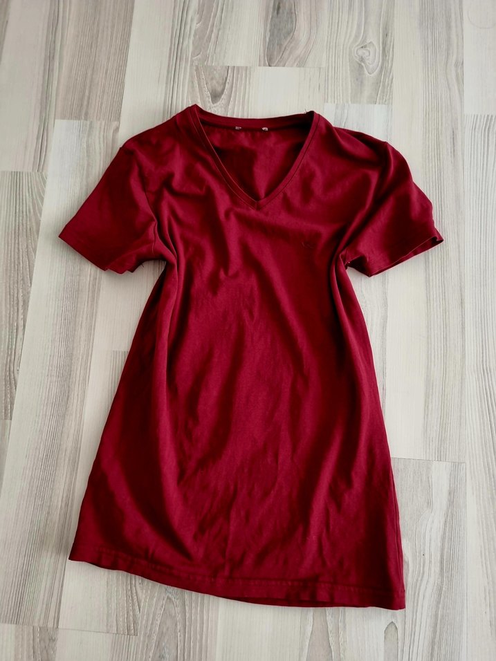 Bordo renkli, V yaka ve kısa kollu kadın tişörtü, yumuşak kumaştan üretilmiştir.