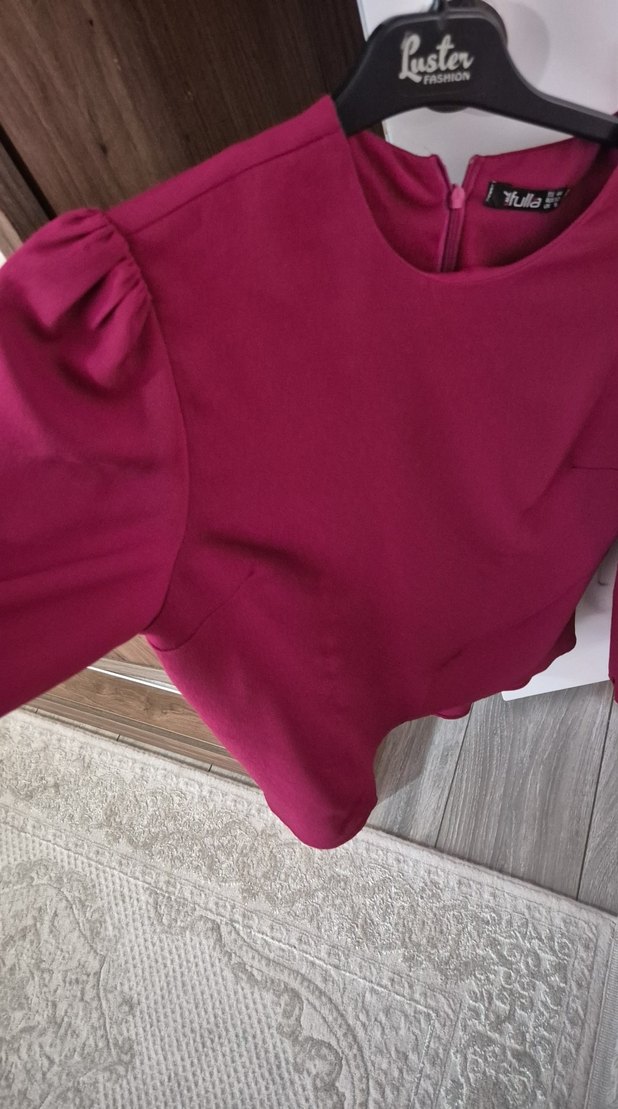 Bordo, V yaka, uzun kollu, kısa ve fırfırlı detaylara sahip, parlak görünümlü, modern kesim bluz. ✨