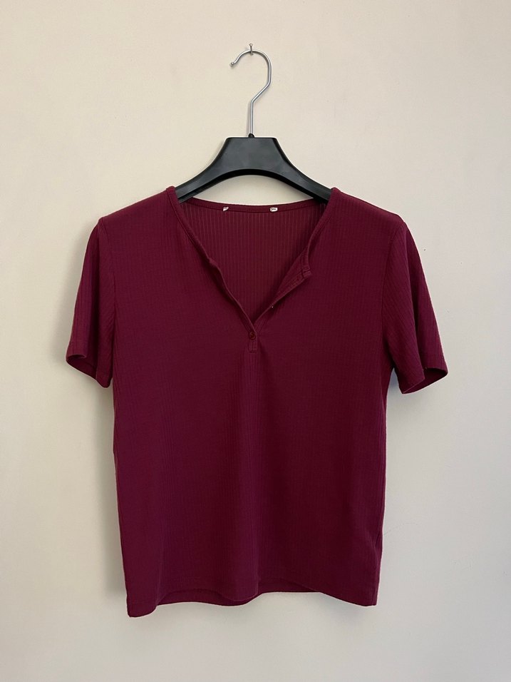 Bordo renkli kadın tişörtü, V yaka ve kısa kolludur. Ürünün ince bir yapısı var. Herhangi bir kusuru yok