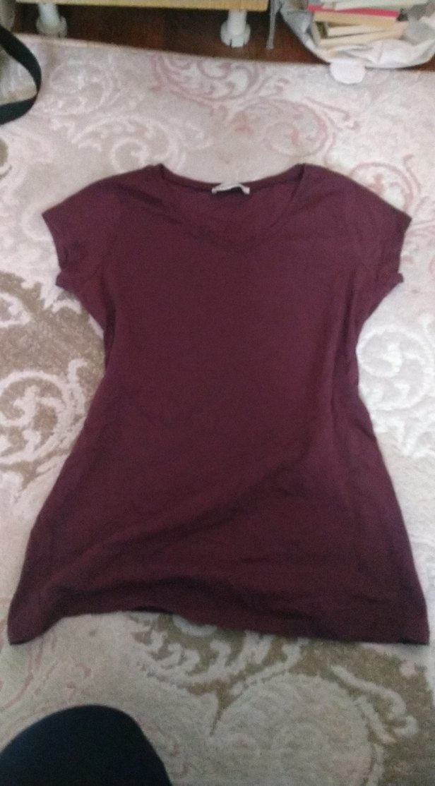 Koyu bordo renkte, pamuk kumaştan yapılmış, V yakalı ve kısa kollu, vücuda oturan kadın tişörtü. Günlük kullanıma uygun, sade ve rahat bir tasarım.