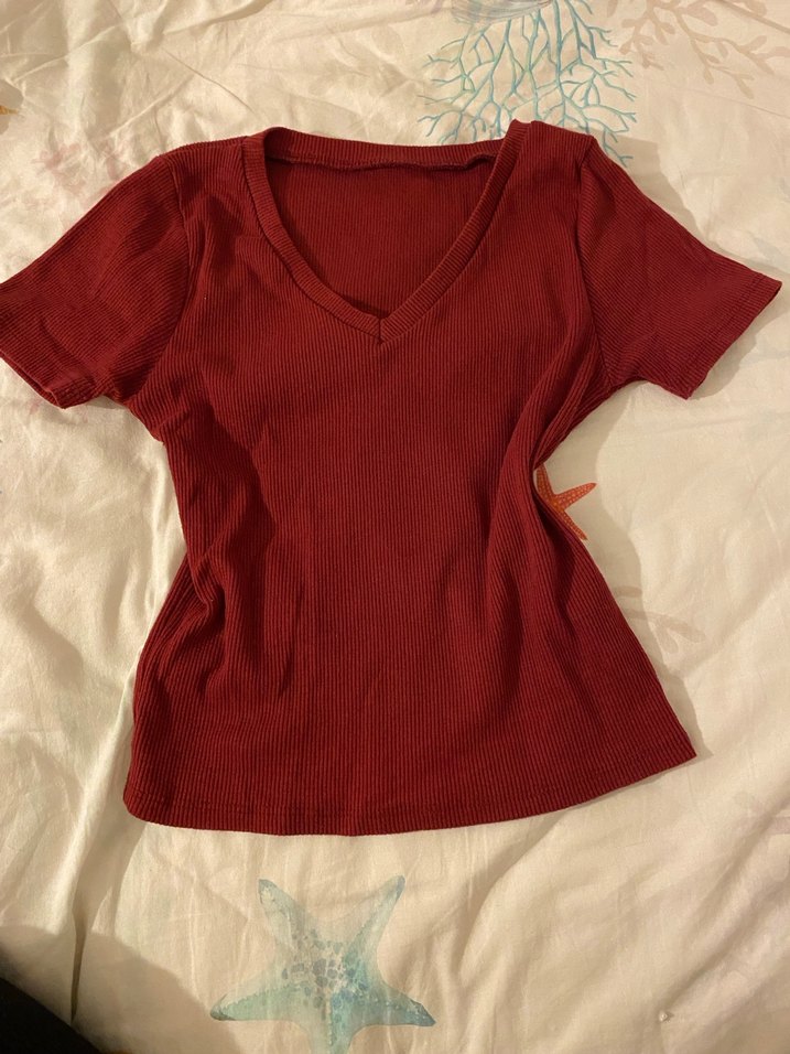 bordo renkli, V yaka ve kısa kollu, kadınlara özel düz kesim tişört.