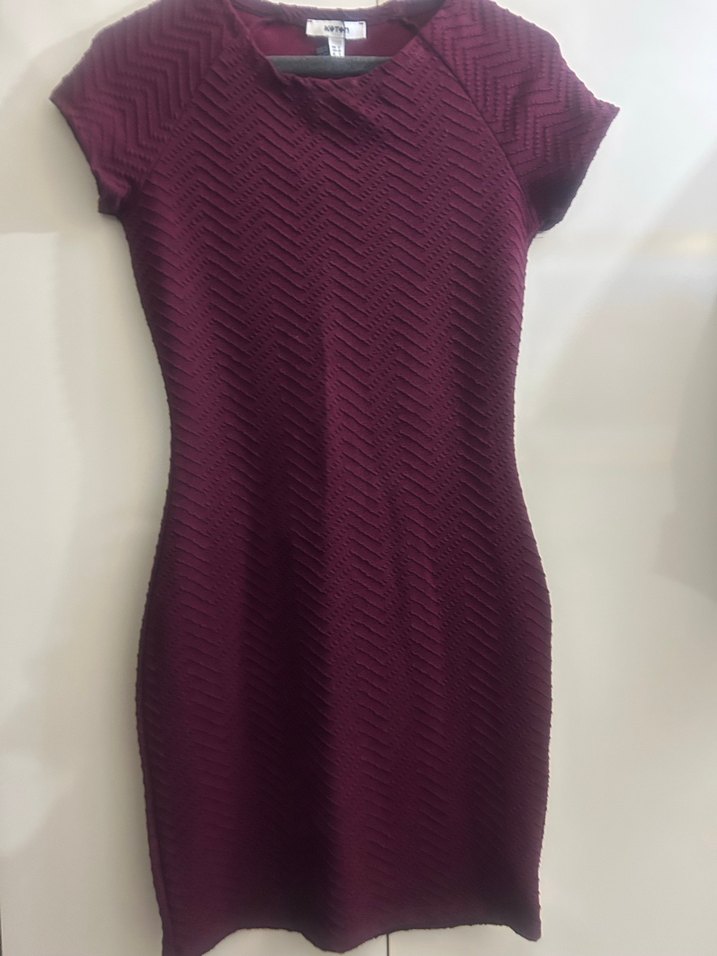 Bordo renkli, kısa kollu ve V yakalı, pileli dokulu midi elbise. Yumuşak sentetik kumaştan, ofis kullanımı için uygun.