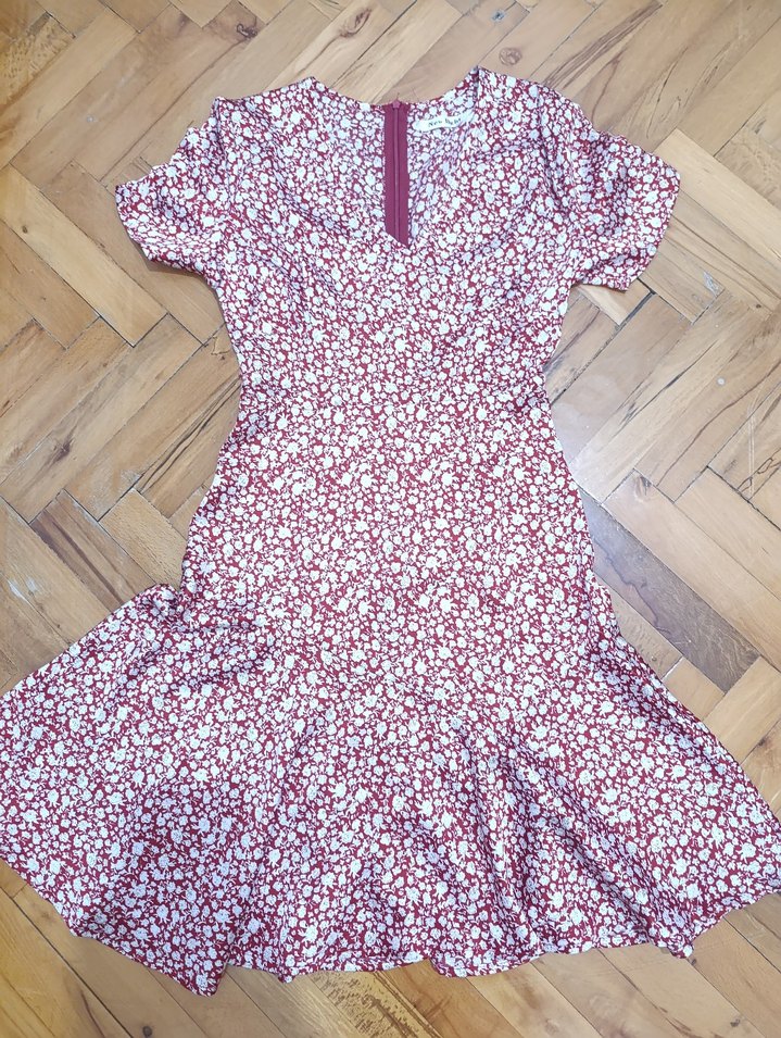 çiçekli bordo v yaka kolları büzgülü fırfırlı elbise(fermuar başlangıcında defosu vardır)