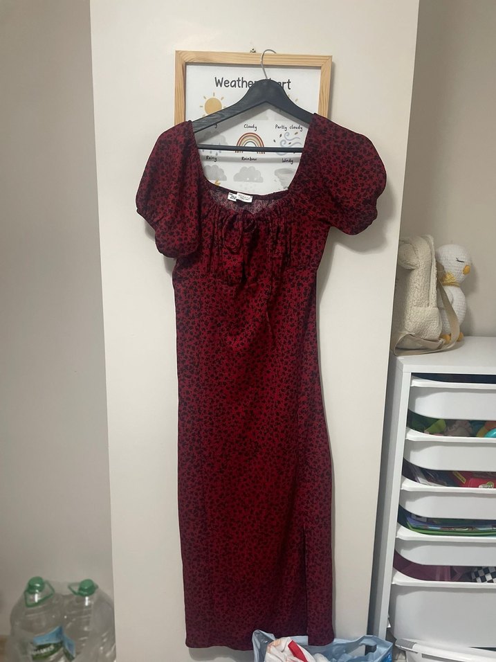 Fitted kesim, kısa şişkin kollu ve V yakalı uzun elbise. Yumuşak sentetik kumaştan, koyu bordo tie-dye desenli, bohem sokak stili. Günlük kullanıma uygun.