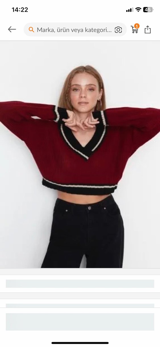 Bordo renkli, V yakalı ve uzun kollu kısa kesim triko kazak. Siyah ve beyaz şerit detaylarıyla sokak tarzına uygun, rahat ve günlük kullanım için ideal. Cok az giyildi yeni dueumda