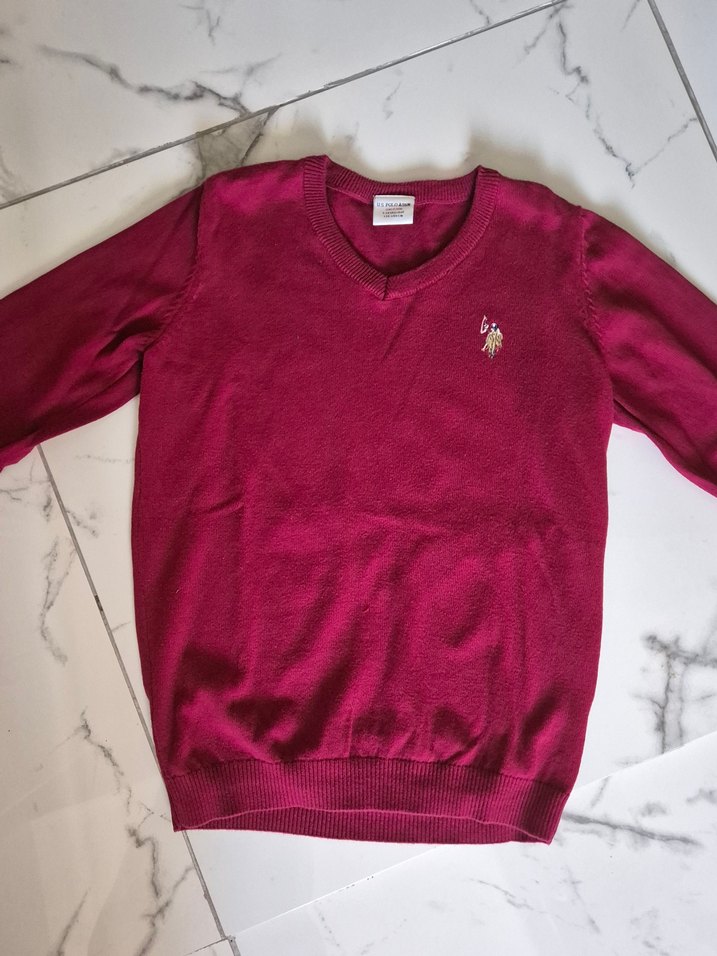 Bordo renkli, yumuşak kumaştan örülmüş, uzun kollu ve V yakalı kız triko kazak. Bol kesimi ve parlak rengiyle şık bir sokak stili sunar.