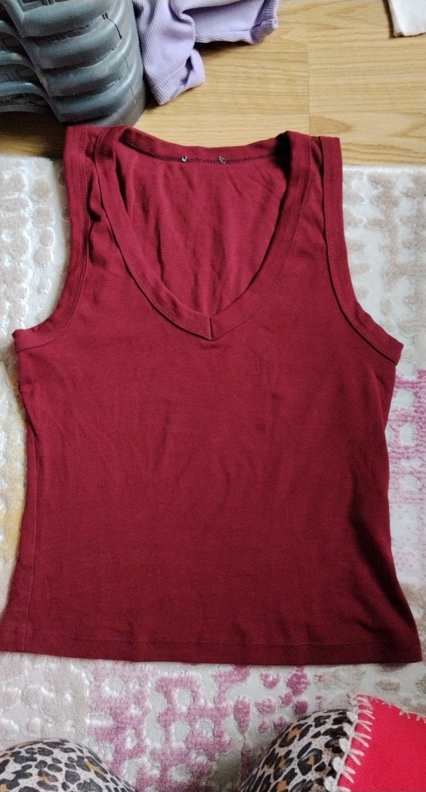 Bordo renk, V yaka ve kolsuz kesime sahip, düzgün sentetik kumaştan yapılmış, normal boyda, dar kesim kadın atlet. Günlük kullanıma uygun sade ve şehir stili.