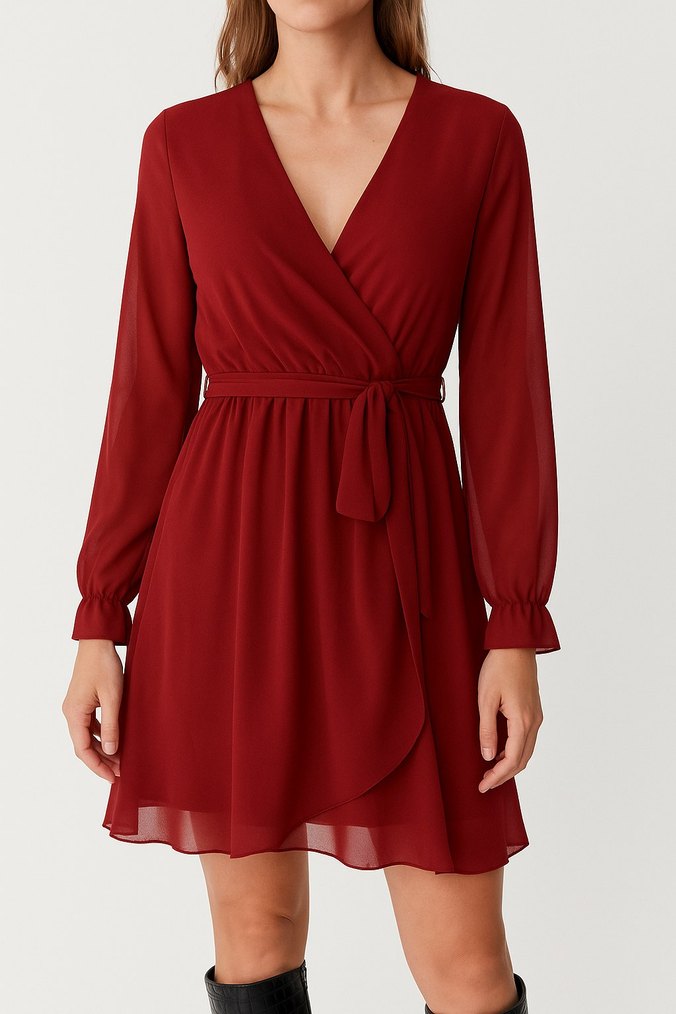 Bordo renk, V yaka ve drapeli tasarıma sahip midi elbise. Rahat kesim ve askılı kollu, yumuşak sentetik kumaştan yapılmıştır, romantik akşamlar için uygun. ❤️