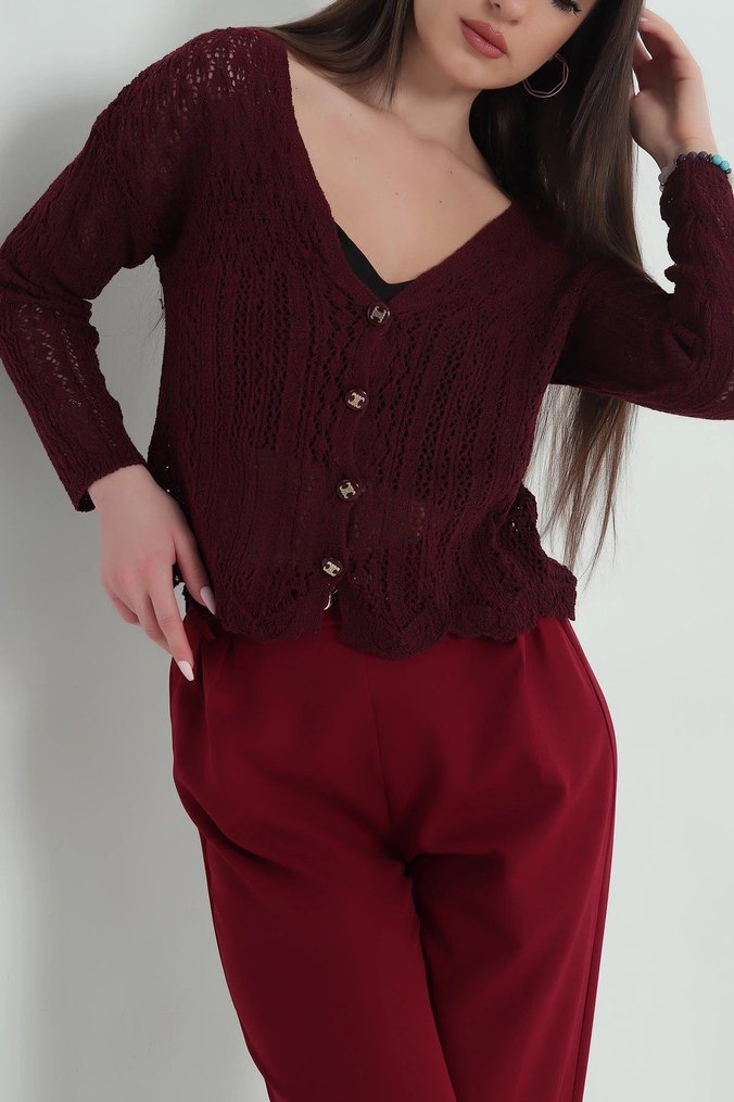 Bordo renk, V yakalı, düğmeli, gevşek kesim ve midi boy örgü hırka, bohem tarz için uygun.