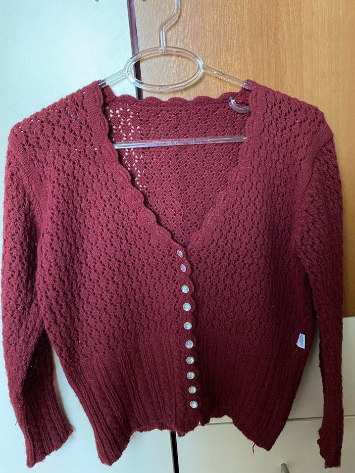 Bordo renkli, V yaka ve uzun kollu örgü kadın hırka. Düğmeli ve bol kesim, günlük kullanıma uygun rahat bir modeldir.